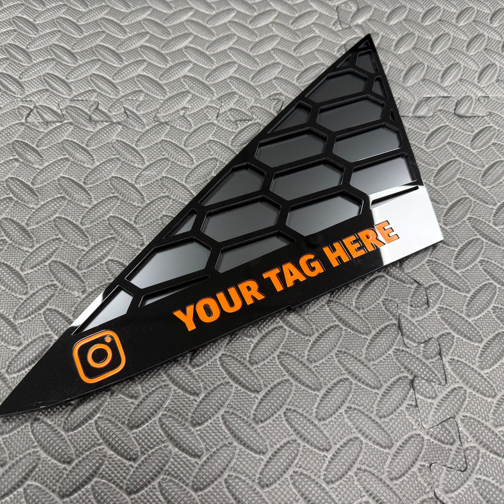 Disponible en noir brillant avec plaque de support noir satiné et cadres argentés, logo « VX » avec « R » et logo souligné dans la couleur de votre choix. Les inserts de fenêtre sont fournis avec un support adhésif pour une fixation facile au véhicule.