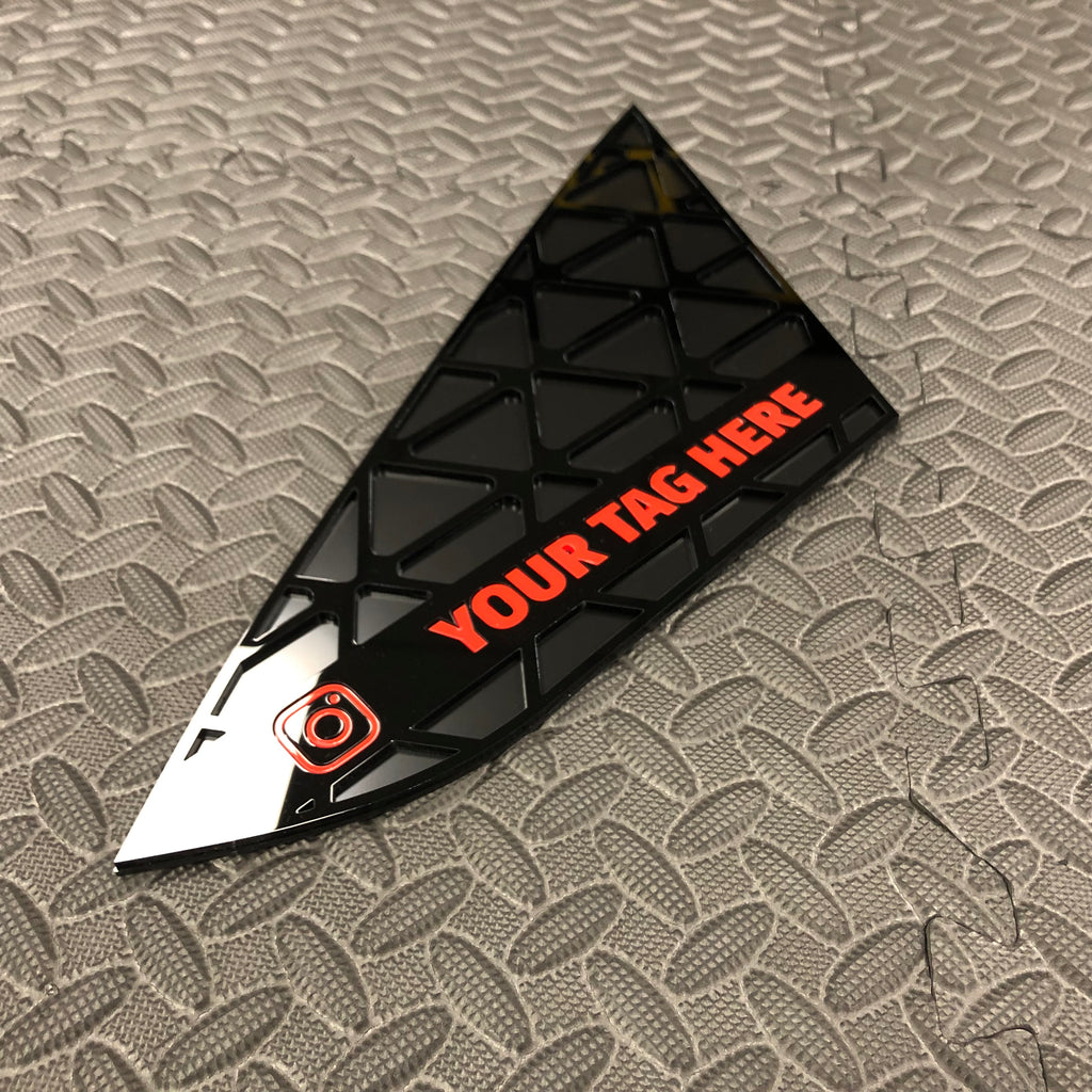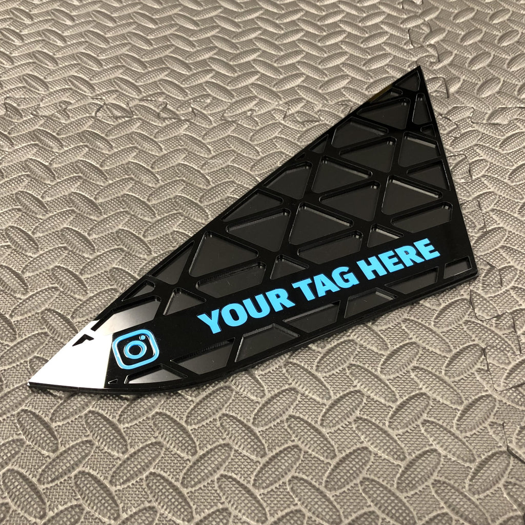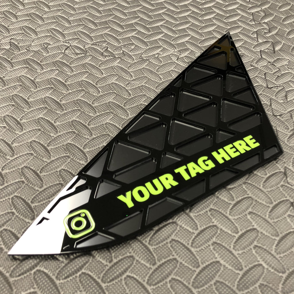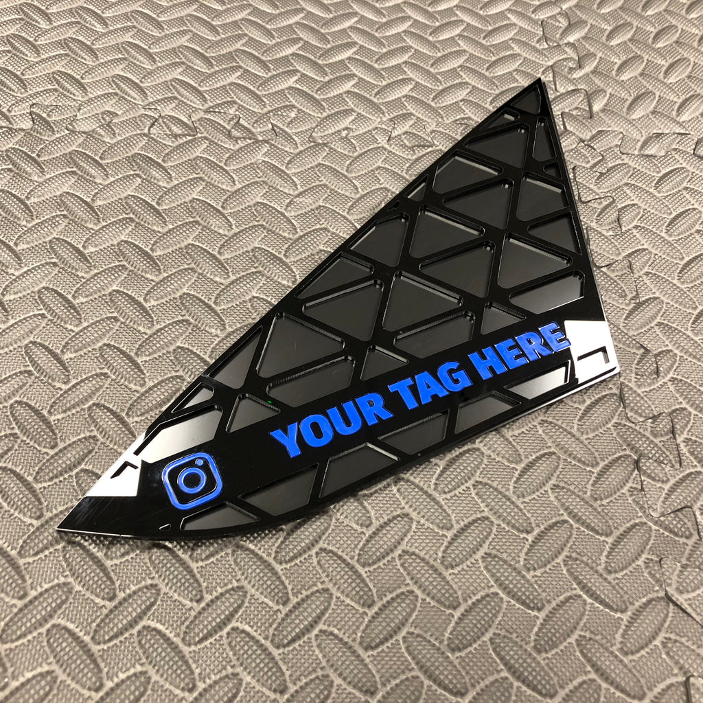 Disponible en noir brillant avec plaque de support noir satiné et cadres argentés, logo « VX » avec « R » et logo souligné dans la couleur de votre choix. Les inserts de fenêtre sont fournis avec un support adhésif pour une fixation facile au véhicule.